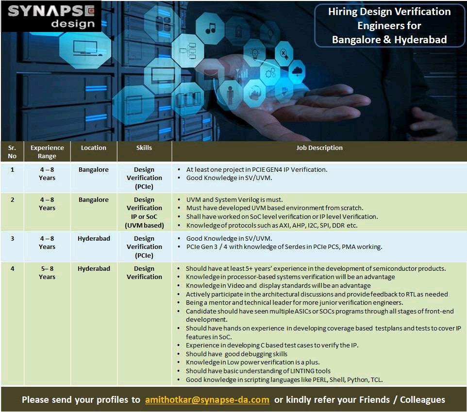 1. DFT Engineers: 4+ yrs 2. SOC Verification : 4+yrs 3. IP verification: 4+ yrs 4. ASIC RTL Design: 4+ yrs 5:STA synthesis Engineers: 4+ yrs Location: Bangalore & Hyderabad Np: immediate to 30 days interested, please share resume to shobhna.yadav@smartsocs.com